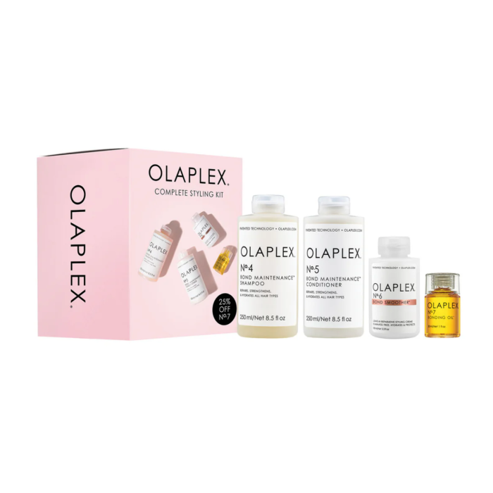Olaplex Complete Styling Kit combines four of the brand’s bestsellers to cleanse, condition, repair, smooth, and protect hair. Featuring the N°4 Bond Maintenance Shampoo and N°5 Bond Maintenance Conditioner, this kit helps restore strength and moisture while keeping hair soft and shiny. The N°6 Bond Smoother offers lightweight leave-in conditioning that reduces frizz and flyaways, while the N°7 Bonding Oil boosts shine, provides heat protection up to 232°C, and improves manageability.
